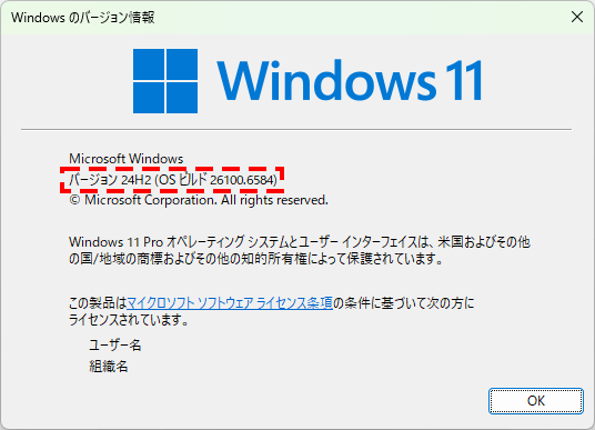 [Windows] + [R]で「ファイル名を指定して実行」ウィンドウから「winver」を入力し、24H2であること確認します。