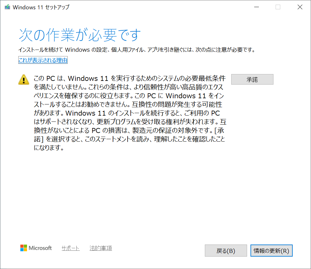 CPUが満たしていない場合に表示されました。なぜかTPMだけなしだと表示されません。 「承諾」をクリックします。 ![]() | 本画面はsetup /product server版になし |