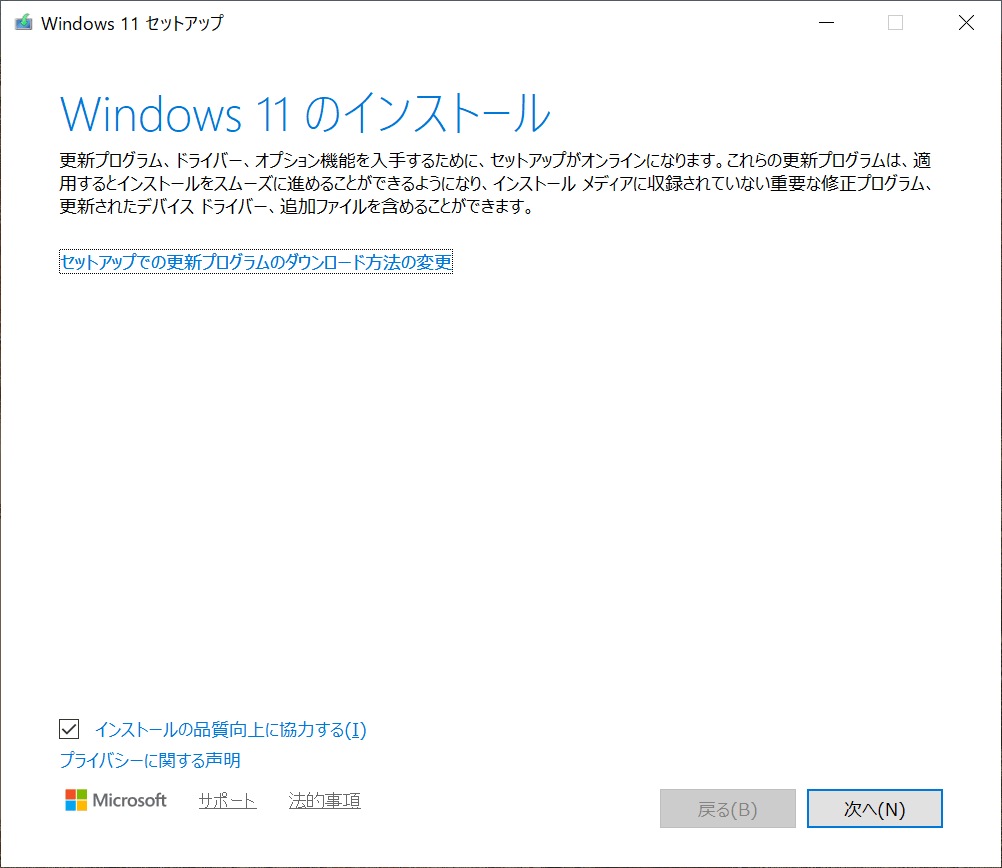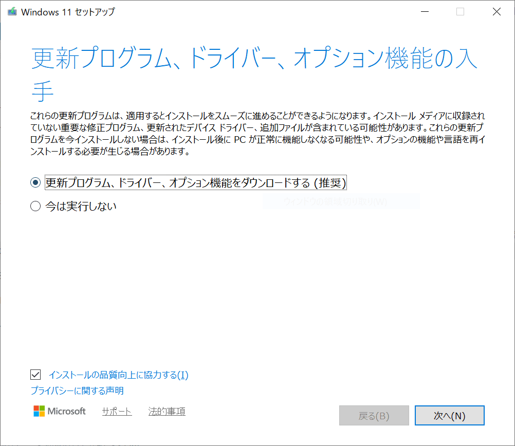 ↑で「セットアップでの更新プログラムのダウンロード方法の変更」をクリックした場合の画面。 「今は実行しない」を選択することでダウンロード時間を短縮できます。 ![]() | ↑で「セットアップでの更新プログラムのダウンロード方法の変更」をクリックした場合の画面。 「今は実行しない」を選択することでダウンロード時間を短縮できます。 ![]() |