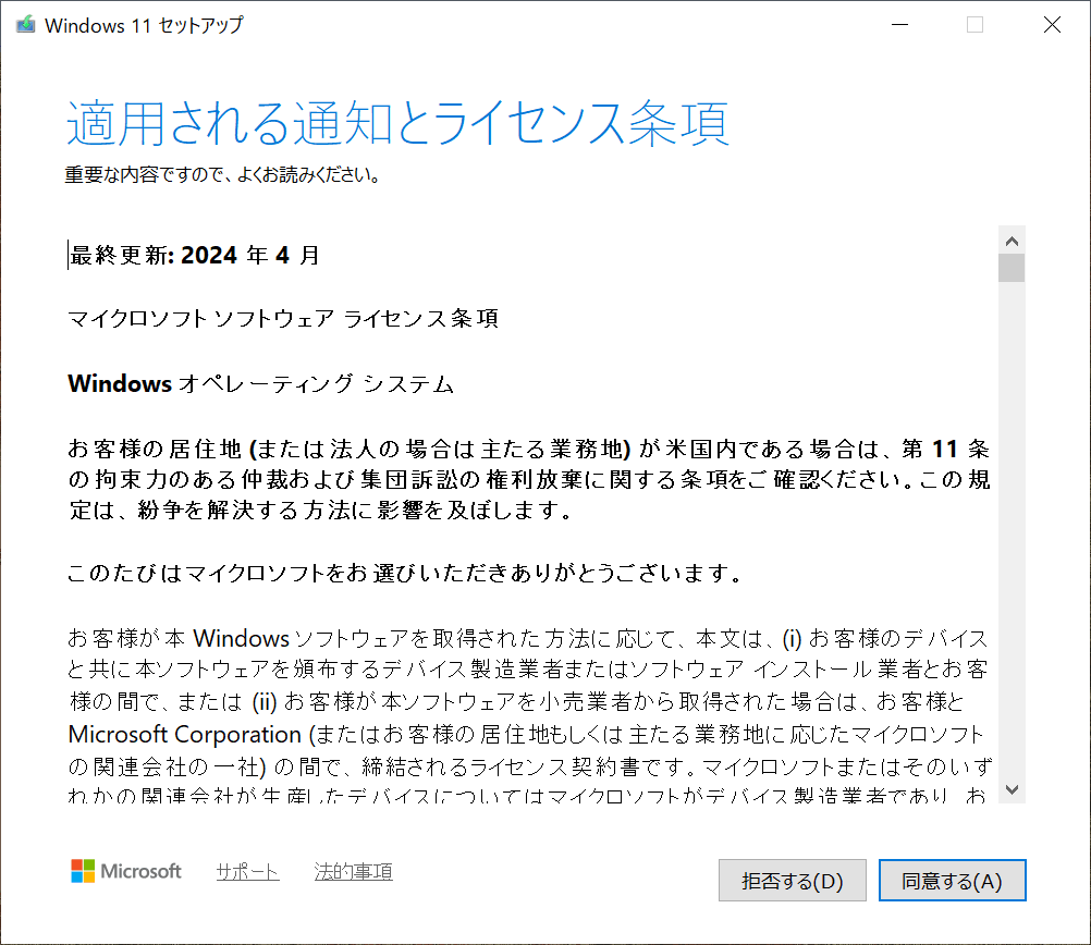 CPUが満たしていない場合に表示されました。なぜかTPMだけなしだと表示されません。 「承諾」をクリックします。 ![]() | 本画面はsetup /product server版になし |