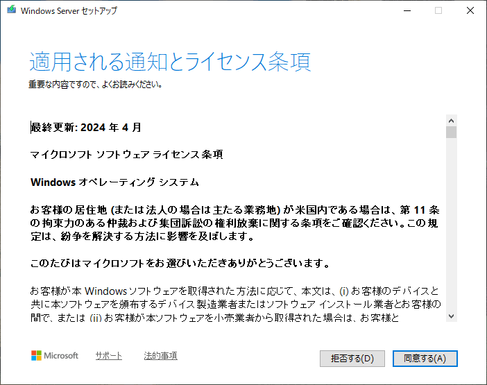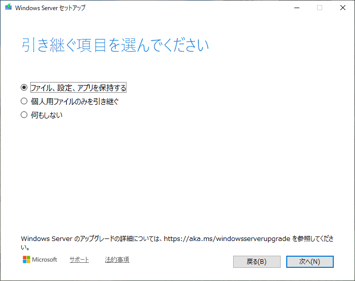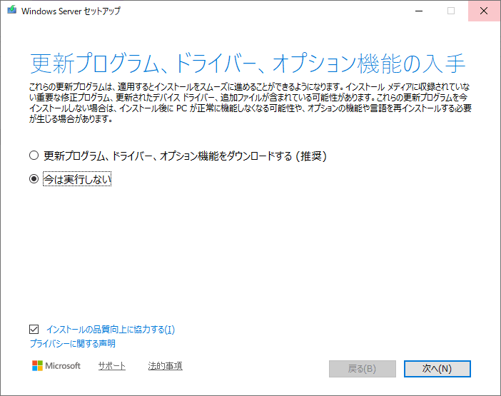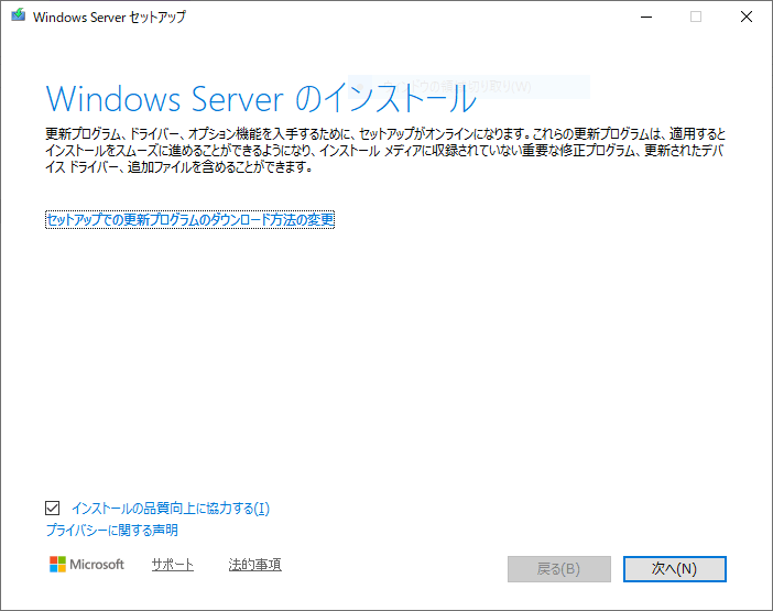 通常は、「次へ」をクリック 急いでいる時は「セットアップでの更新プログラムのダウンロード方法の変更」をクリックします。 ![]() | Windows Serverのインストールと書いてありますが、正常な動作です。「次へ」をクリックします。 通常は、「次へ」をクリック 急いでいる時は「セットアップでの更新プログラムのダウンロード方法の変更」をクリックします。 ![]() |