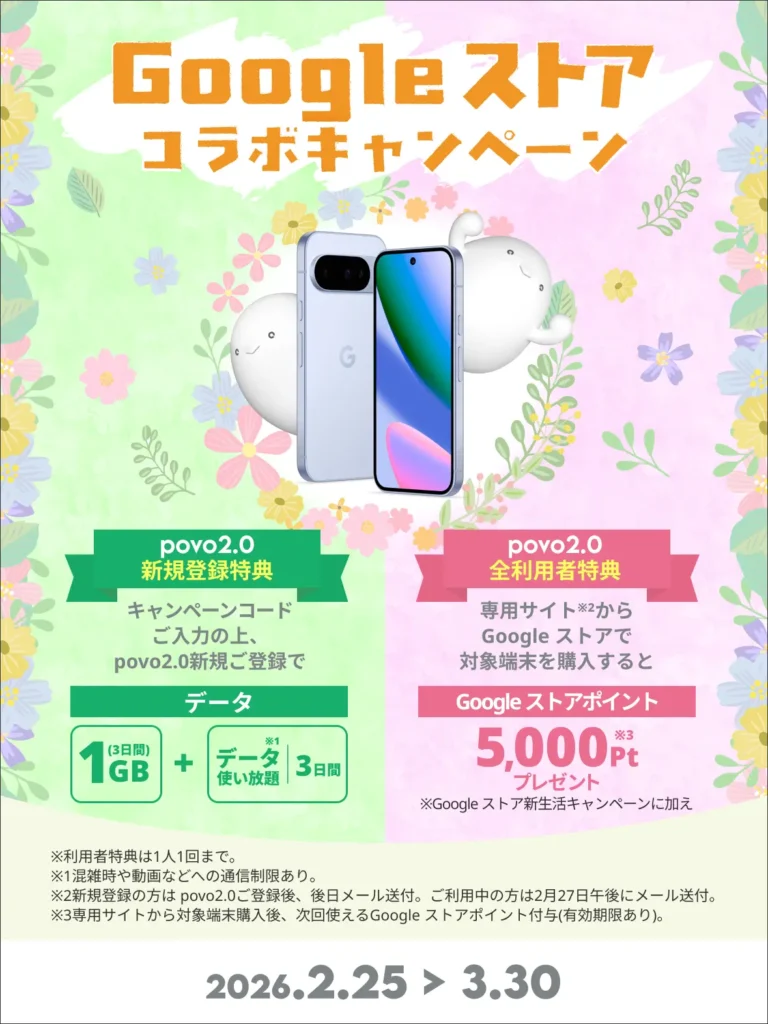 Google ストア新生活キャンペーン 2026のイベントでpovoから送信されるメール経由でPixelスマホを買うとGoogle ストアポイントを5,000ptを手に入れることが出来ます。以下のように実質79,800円で購入することができるので興味のある方は試してください。