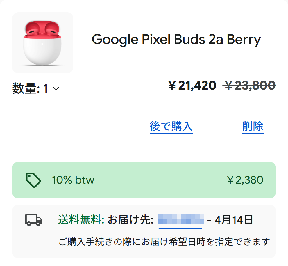 Pixel スマホを購入すると10%OFFクーポンがもらえます。クーポンを利用するとPixel Buds 2aが21,420円です。