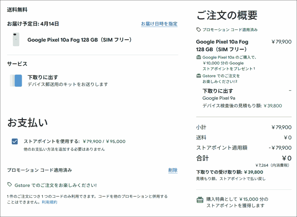 無念にもPixel 10aに学割の10%OFFを適用できず。新発売セールにより1万円のストアポイント。事前登録により5,000円分のストアポイントがもらえるため、次回の注文から合計15000円分のクーポンが使えます。ストアポイントは2年間有効です。