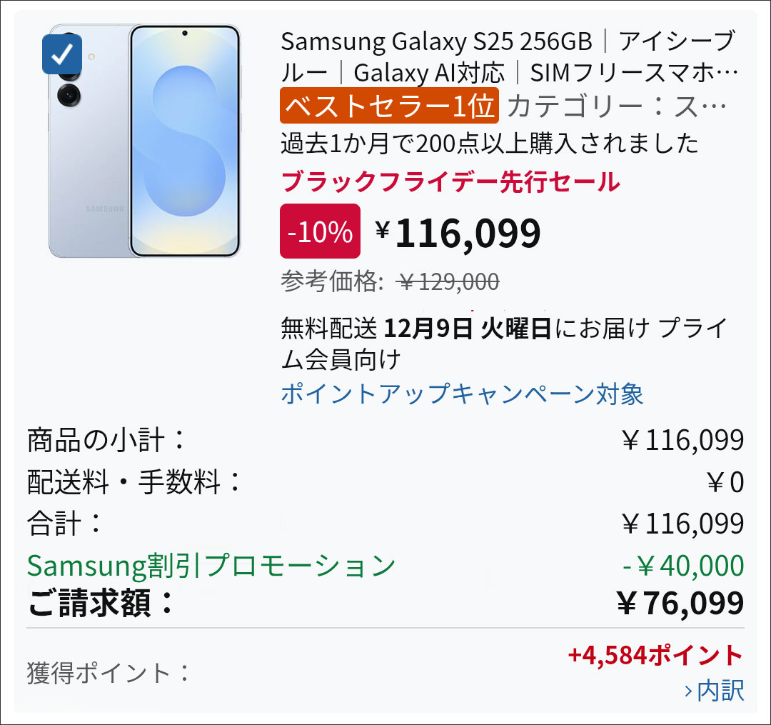 本命はSamsung Galaxy S25 76,099円「Amazonブラックフライデー & プレミアムスマホ乗り換えキャンペーン」