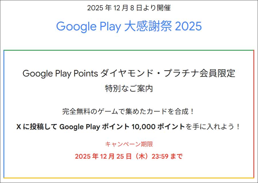 Google Play 大感謝祭 2025 は12 月 8 日(月)9時から2026 年 1 月 9 日(金)午前 8:59までです。2025年12月14日で7日目です。20日間ログインす ...