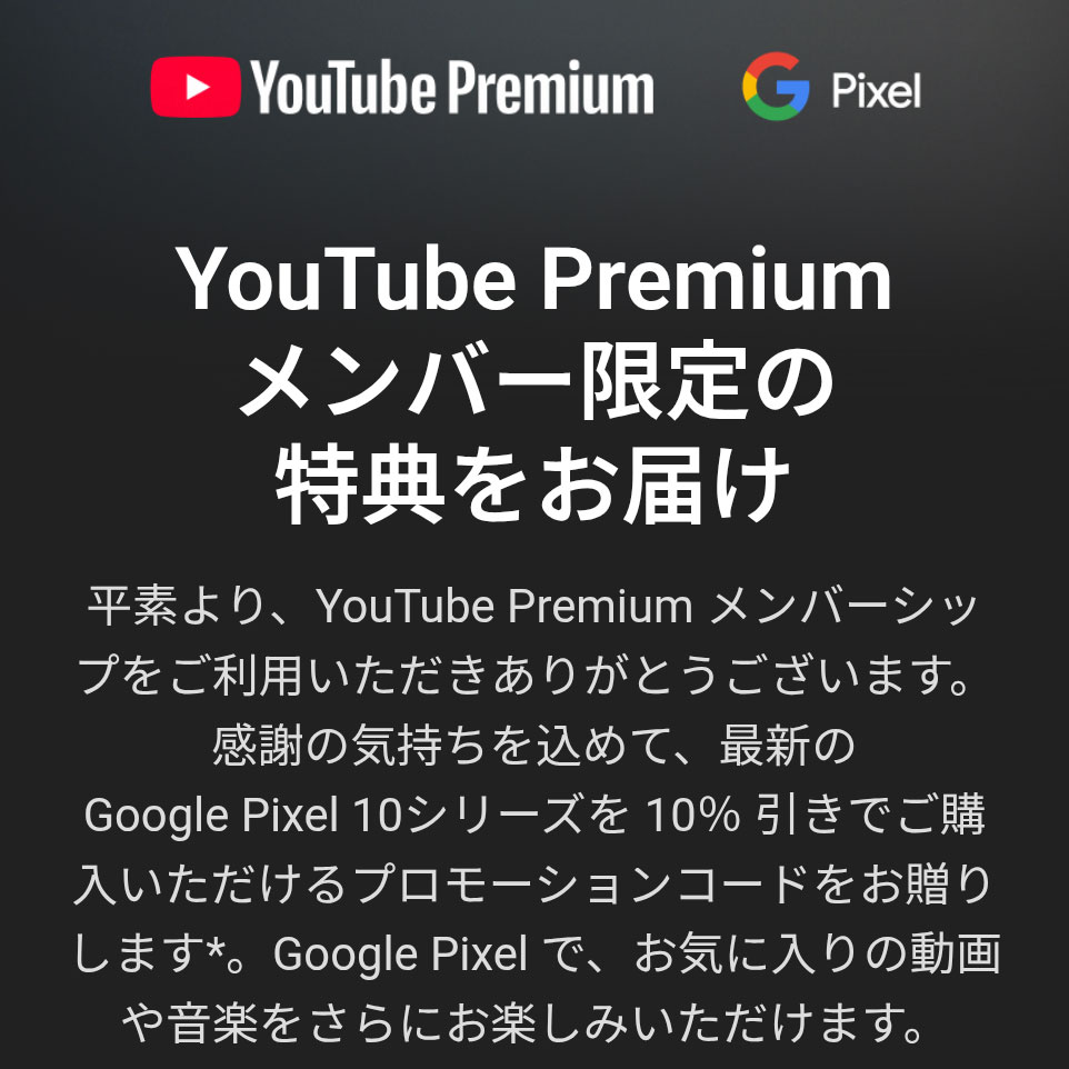 YouTube Premium メンバー向けにGoogle Pixel 10 シリーズが10%引きになるクーポン配布中 Google ストア ホリデーセール 2025