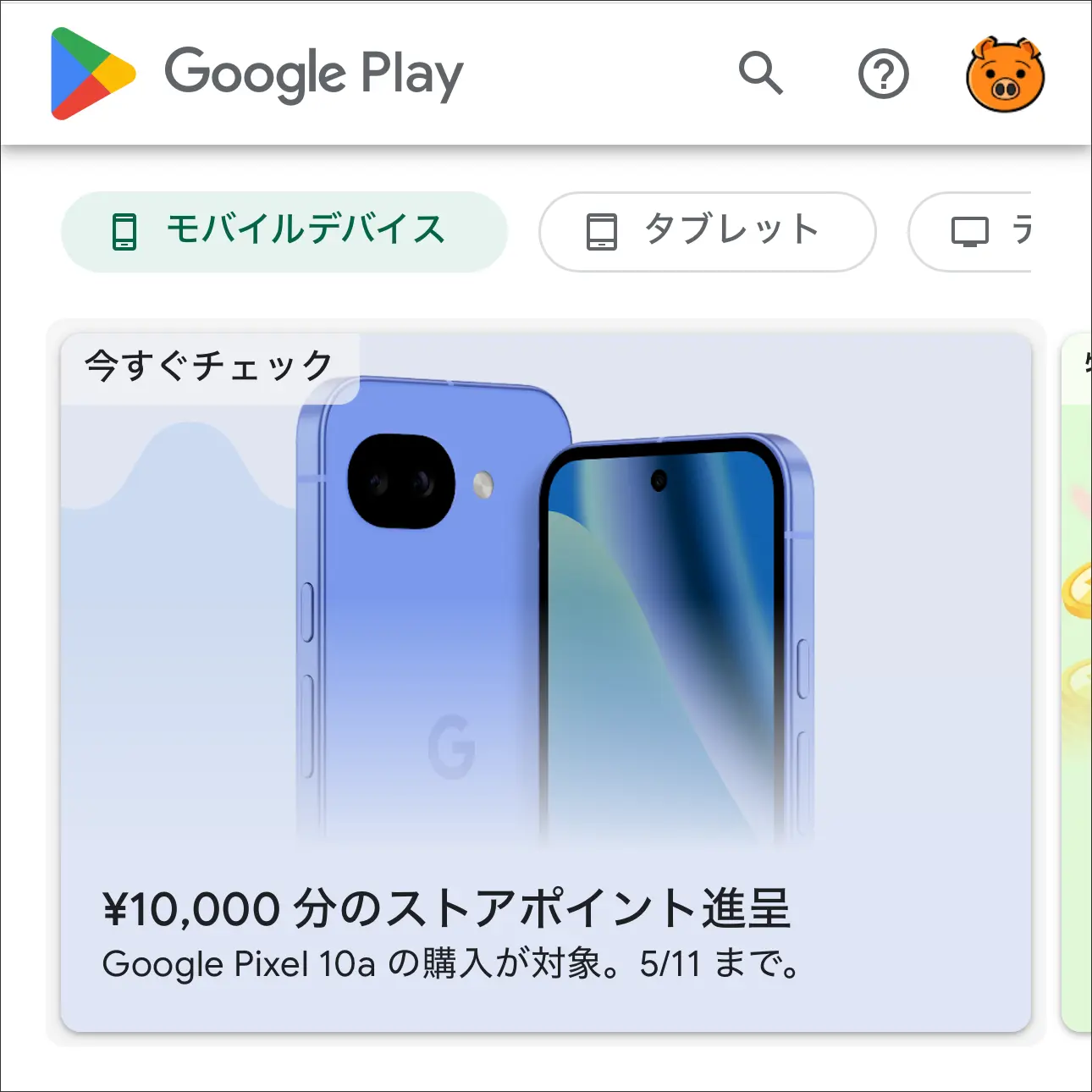 ブラウザ版 Google Playに「¥10,000分のストアポイント進呈」のクーポンが登場 2026年4月27日にPixel 10aの新発売セールが終了し最安は10%OFFのクーポンかと思っていまし ...