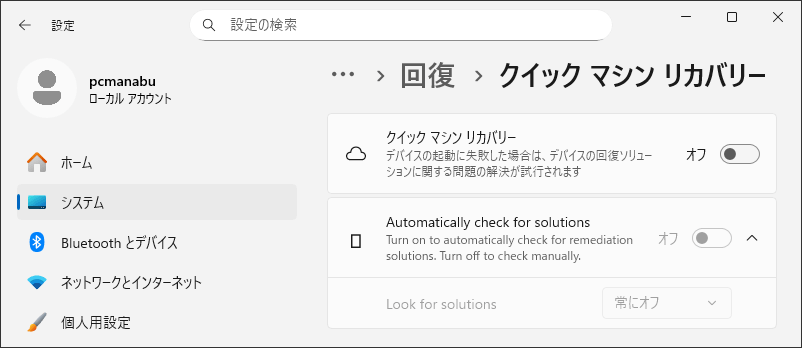 • 設定で「quick machine recovery」と「automatically check for solutions」が有効な場合、一度のスキャンで解決策が見つからなければ即座に代替回復方法を提示。