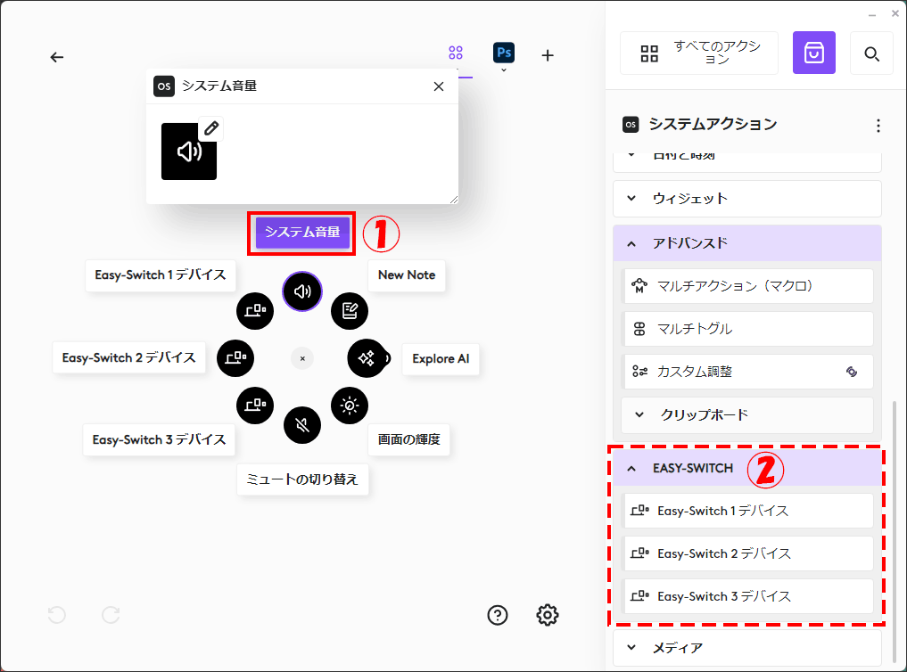 Logicool MX Master 4なら従来の操作に加えてマウスの裏を見ることなくEasy-Switchボタンの操作がActions Ringで出来ます。