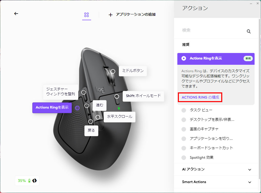 Logi Options+アプリを起動し、Action Ringを指定したいボタンを選びます。「ACTIOMS RINGの構成」をクリックします。