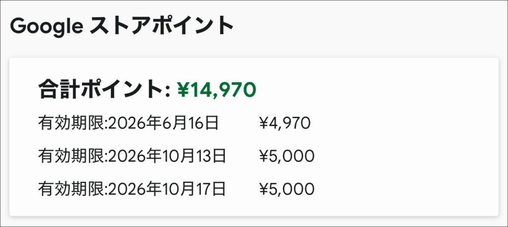 ストアポイント 30,000円で購入したので以下のように4,970円が残った形です。