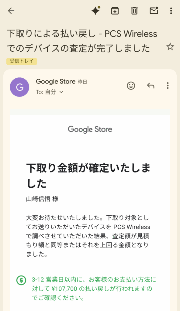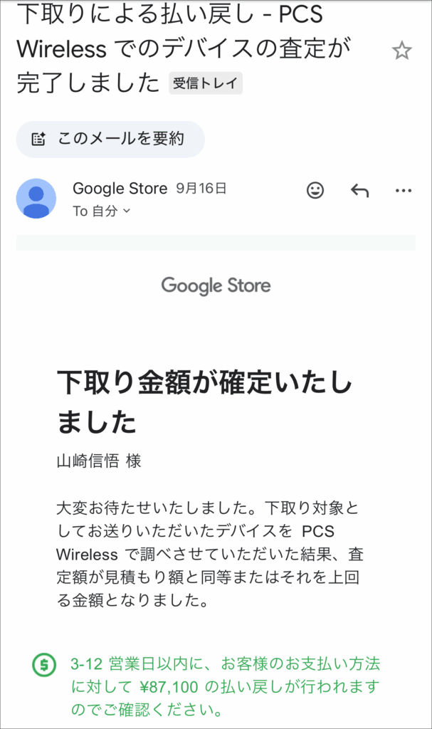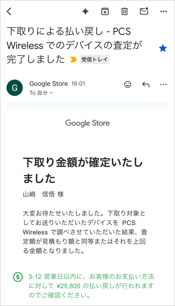 最後となるPixel Watch 3の下取りも満額でした。2025年10月24日の査定でした。ストアポイント 30,000円分と下取りの25,800円で購入したので実質0円で購入出来ました。