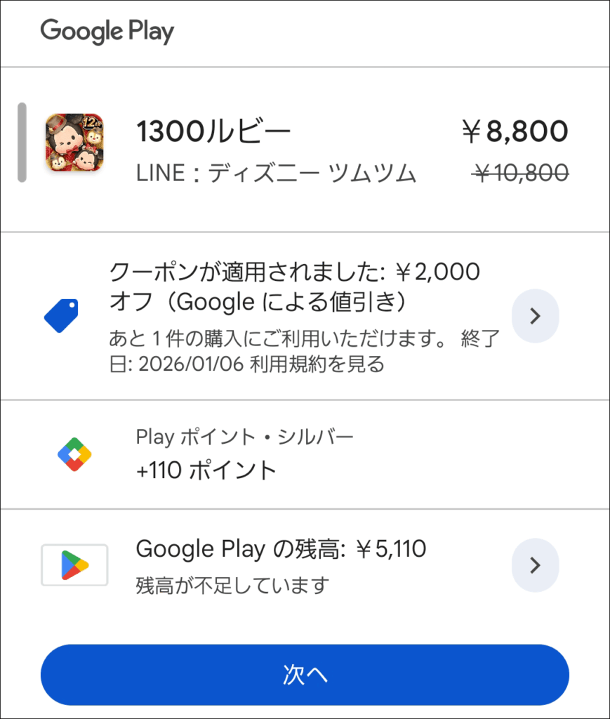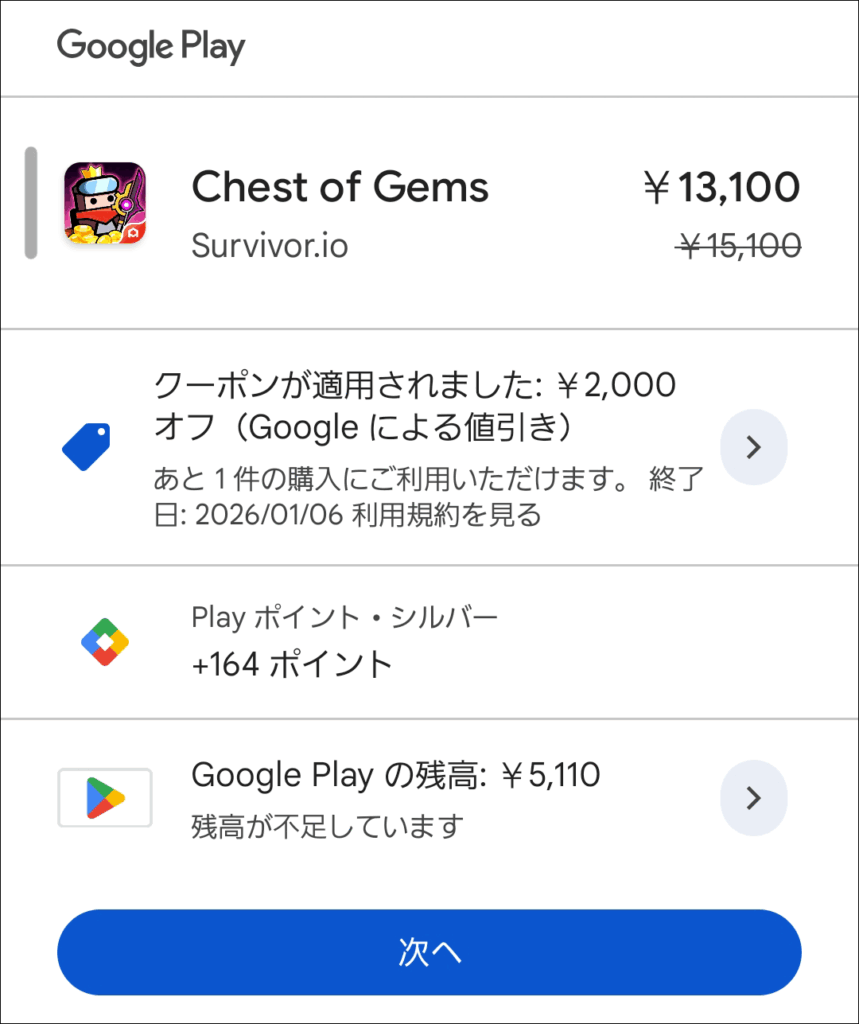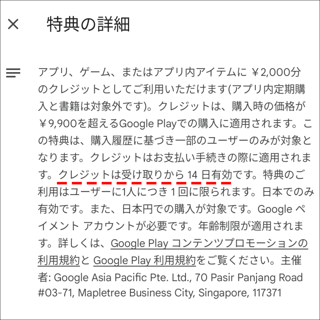 ※紛らわしい表現です。単なる2000円オフです。 - クレジットは、購入価格が9,900円を超えるGoogle Playでの購入に適用されます。