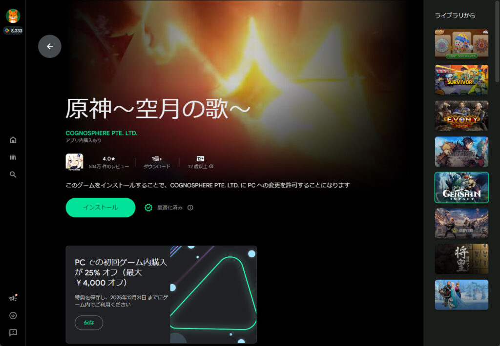 PC での初回ゲーム内購入が 25% オフ(最大 ¥4,000 オフ)イベントも実施しているので興味のある方はチャレンジしましょう。
