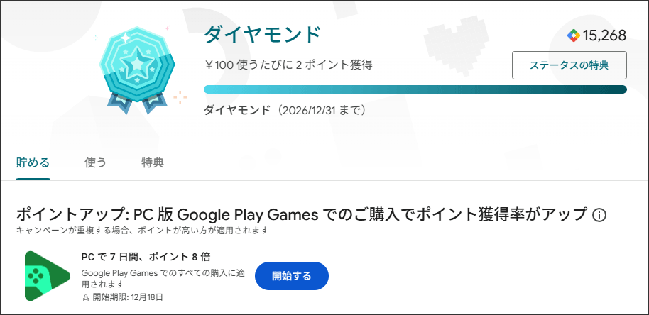 12月4日から18日にPC版 Google Play Games でポイントブースターを有効にすると、7日間すべてのゲー ム内購入でポイントが8倍になります。
