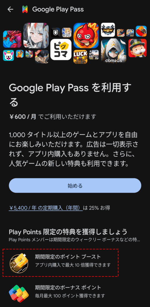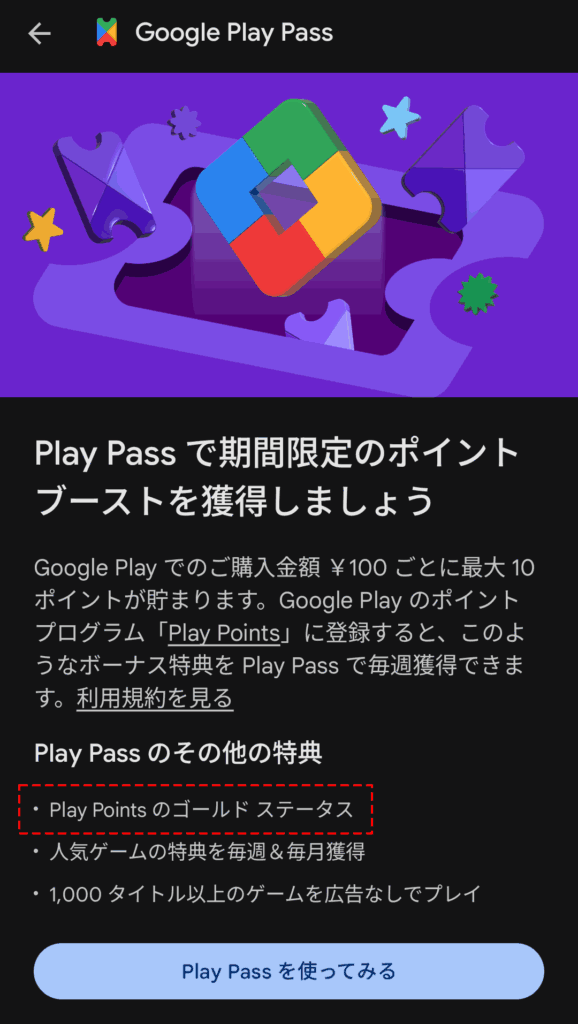 右上のアイコンをタップし、「Play pass」を選択することで以下の画面になります。