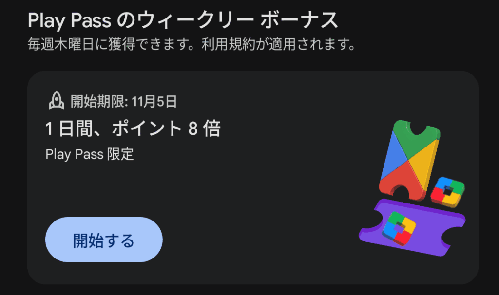 100円で1ポイントですが、8倍にすることが可能です。Goolge Play Passに入会すると毎週1日だけ8倍にするチャンスがあります。