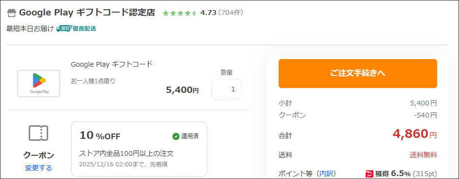 4,860円で5,400円分のクーポンを購入でき、ポイントも付与されます。私の例だと178pt。