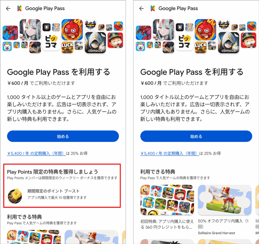 左は、一度もGoogle Plays Passに入っていない時の状態。