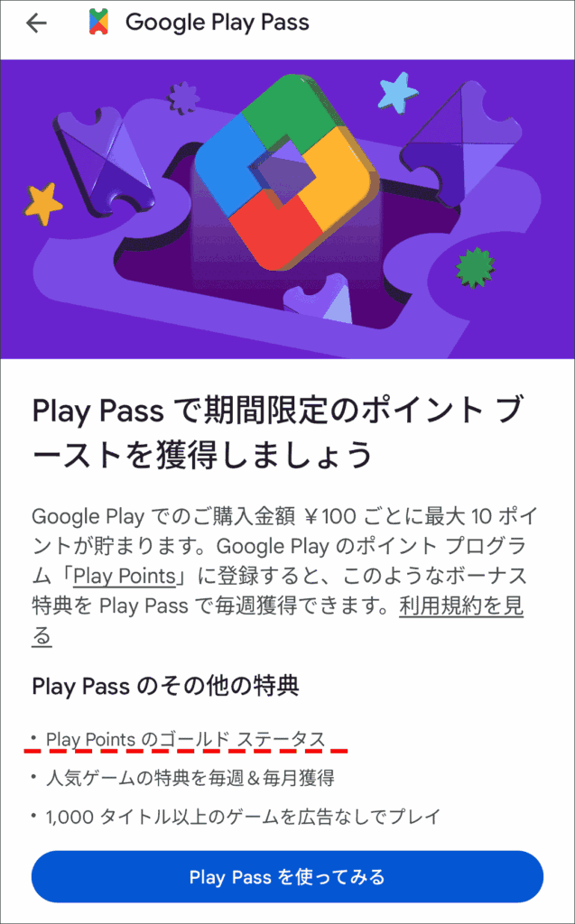 冒頭右の「Play Points 限定の特典を獲得しましょう」のボタンがない時に、Google Play Passに入会してもゴールドステータスにはなりませんでした。