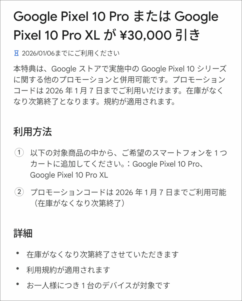 本 特典 は 、Google スト ア で 実施 中 の Google Pixel 10 シリ ー ズに 関す る 他 の プロ モー ショ ン と 億 用 可能 で す 。 プ ロモ ーションコー ド は 2026 年 1 月 7 日 まで ご 利 3 い だ け ます 。 在 庫 が な くな り 次 第 終了 と な り ま す 。 規約 が 適用 され ます 。