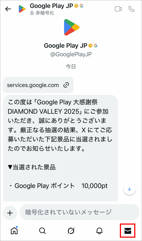 2026年1月23日10:33にみごと「Google Play ポイント 10,000pt」に当選したのですが、当選当初はメールではなくXに連絡に来たのか謎でした。