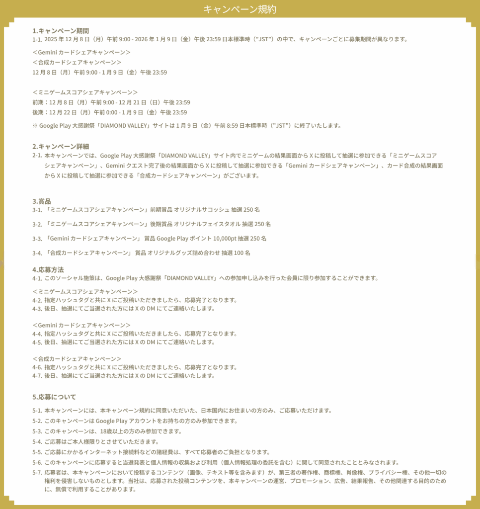 この度は「Google Play 大感謝祭​ DIAMOND VALLEY 2025」にご参加いただき、誠にありがとうございます。厳正なる抽選の結果、X にてご応募いただいた下記景品に当選されましたのでお知らせいたします。