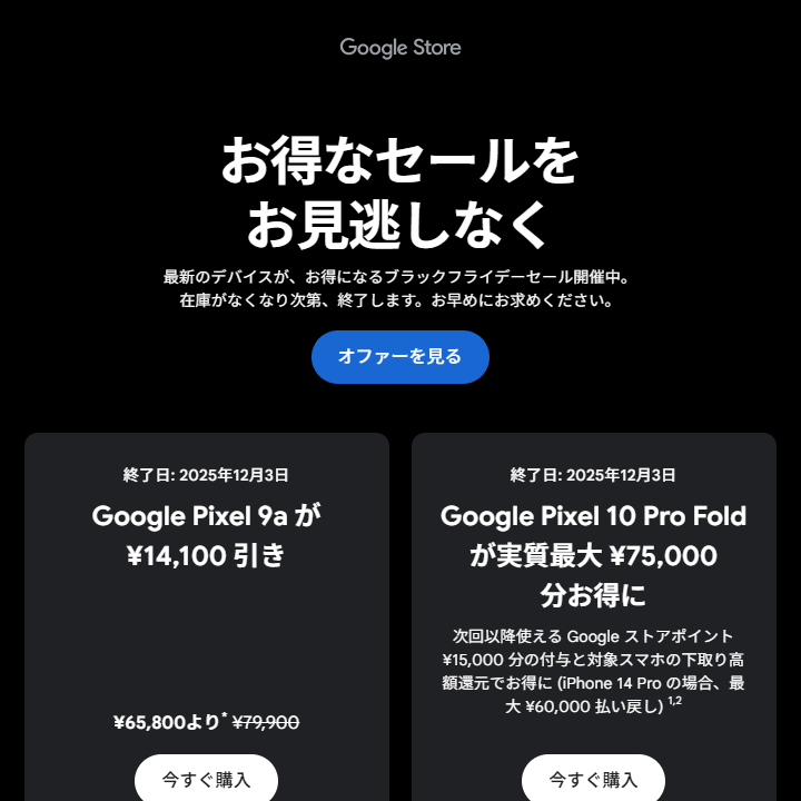 Google ストア ブラックフライデー セールが2025年12月03日に終了します。メールにて告知が来ました。
