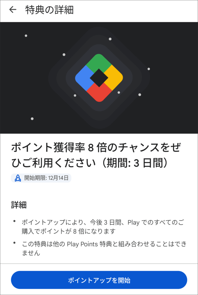 12月14日(日)までゴールドステータス以上の方を対象に「ポイントアップ: Google Play でのすべての購入でポイント獲得率がアップ」を開催しています。自動更新もポイントアップの対象になるため誰もが「ポイントアップを開始」を押した方が良いでしょう。