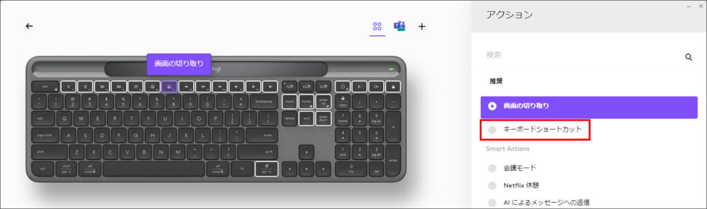 問題が発生するキーボードを選択します。「画面の切り取り」だとSnipping Toolが起動します。そこで「キーボードショートカット」を押します。