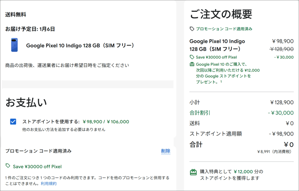 Pixel 10 無印 に3万円引クーポンを適用すると98,900円。紹介イベントで得たストアポイントを付与することでお金を支払うことなくゲットできます。しかも12,000円のストアポイントももらえます。