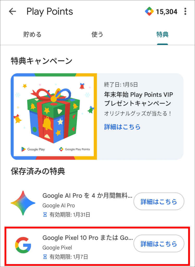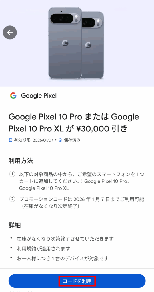 アカウントAの3万円引クーポン番号を抽出します。通常通り「特典」の所から、「Google Pixel 10 Pro または Google Pixel 10 Pro XLが30,000 引き」をタップします。