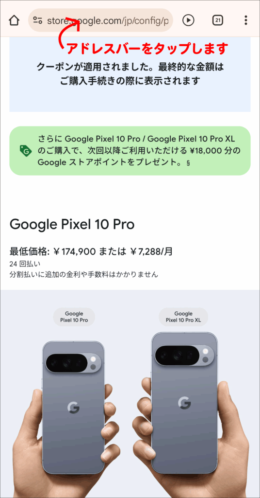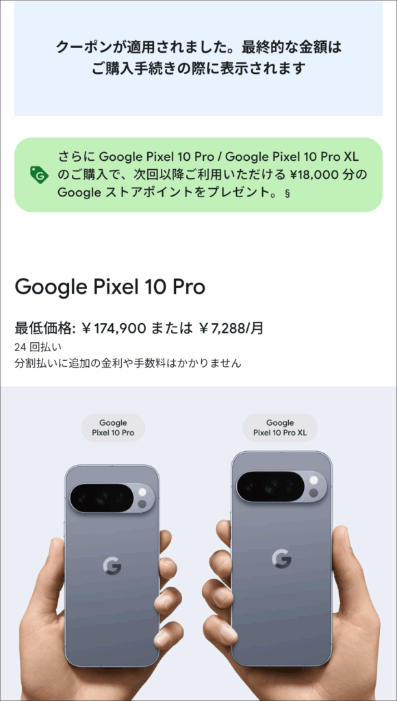 Google StoreでPixel 10シリーズを購入するときにクーポンコード=プロモーションコードを貼り付けます。