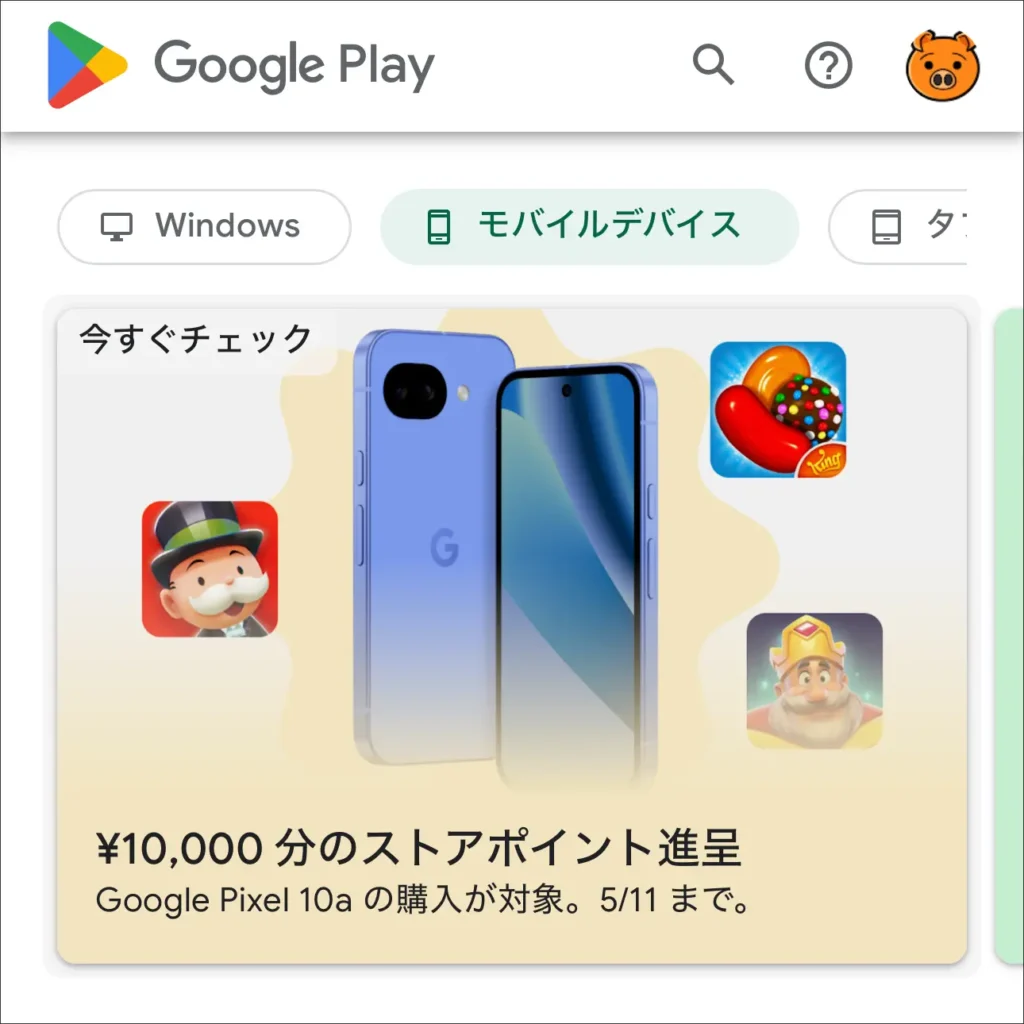 5月11日まで!Pixel 10a ブラウザ版 Google Playに「¥10,000分のストアポイント進呈」のクーポンが登場