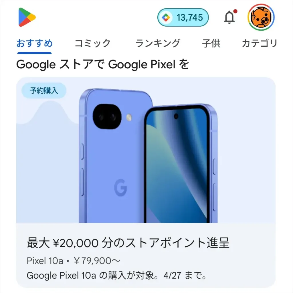 Pixel 10aには、2万円分のストアポイントがあたるキャンペーンを実施してます。