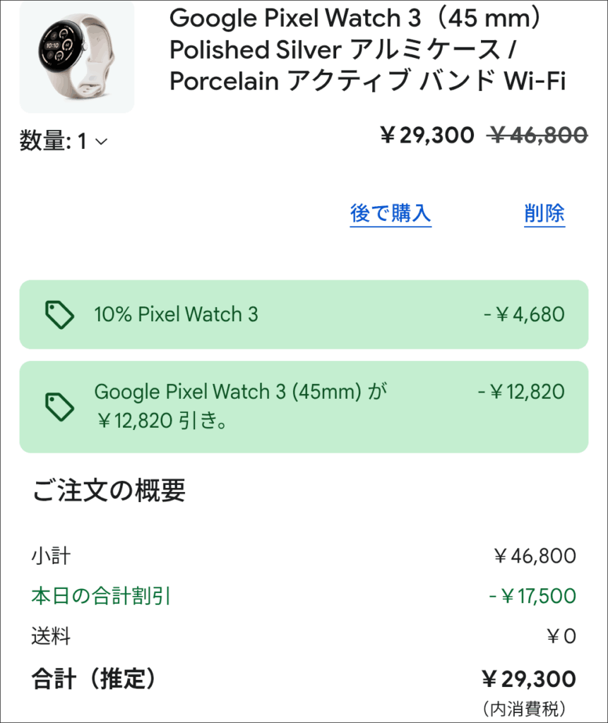 Pixel Watch 初代なら5,200円減額となり、24,100円です。