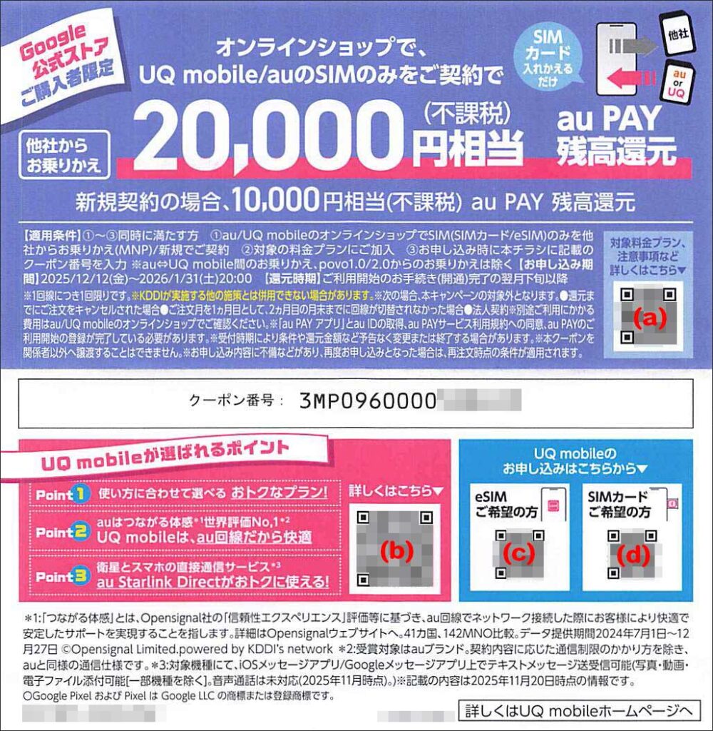 au / UQ mobile オンラインショップ で、Google Pixel 10 / 10 Pro の購入後に送付されるチラシに記載されたクーポンコードを入力し、対象 SIM の契約された方に最大 ¥20,000 相当の au PAY 残高をプレゼントします。 キャンペーンは 2026年1月2日 までです。