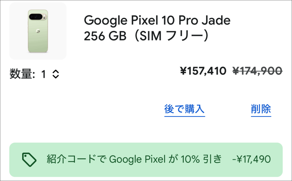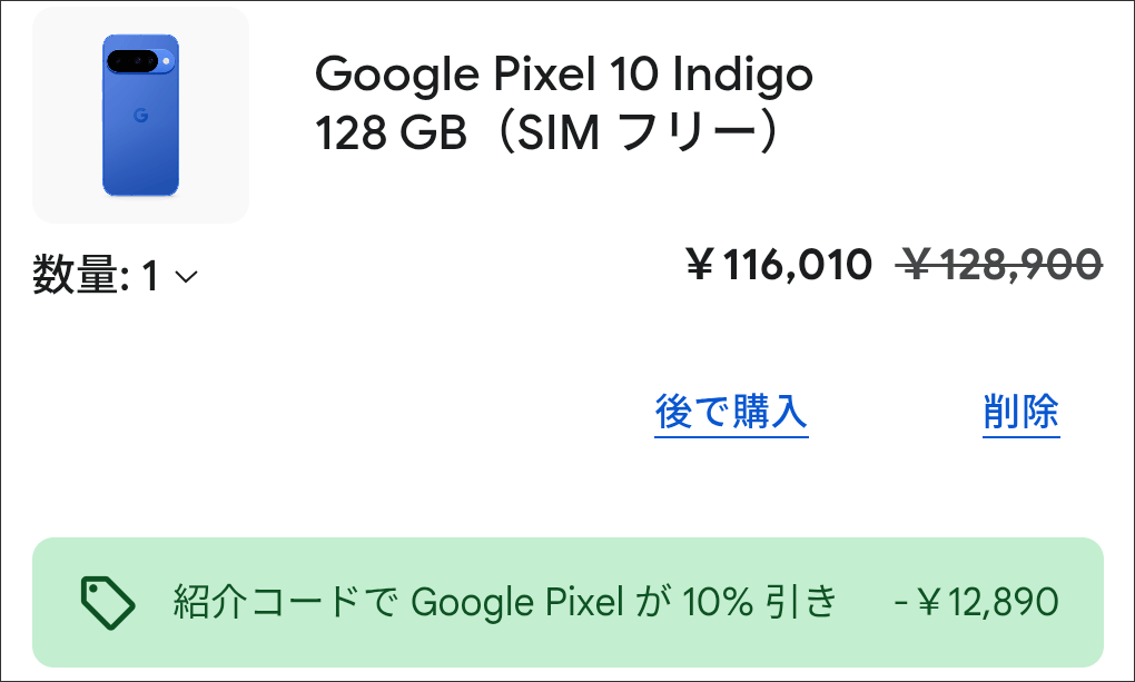 Pixel 10の場合は、対象スマホの下取り高額還元でお得になる可能性があります。 Google Pixel 9 の場合、最大 ¥49,100 払い戻しです。