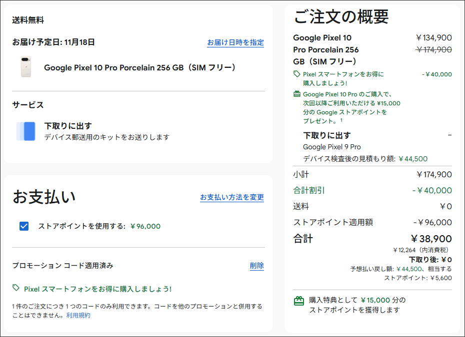 Pixel 10なら116,010円 - 15,000ptで実質101,010円です。Pixel 8 Proと比べて17200円の価格差は悩ましい。
