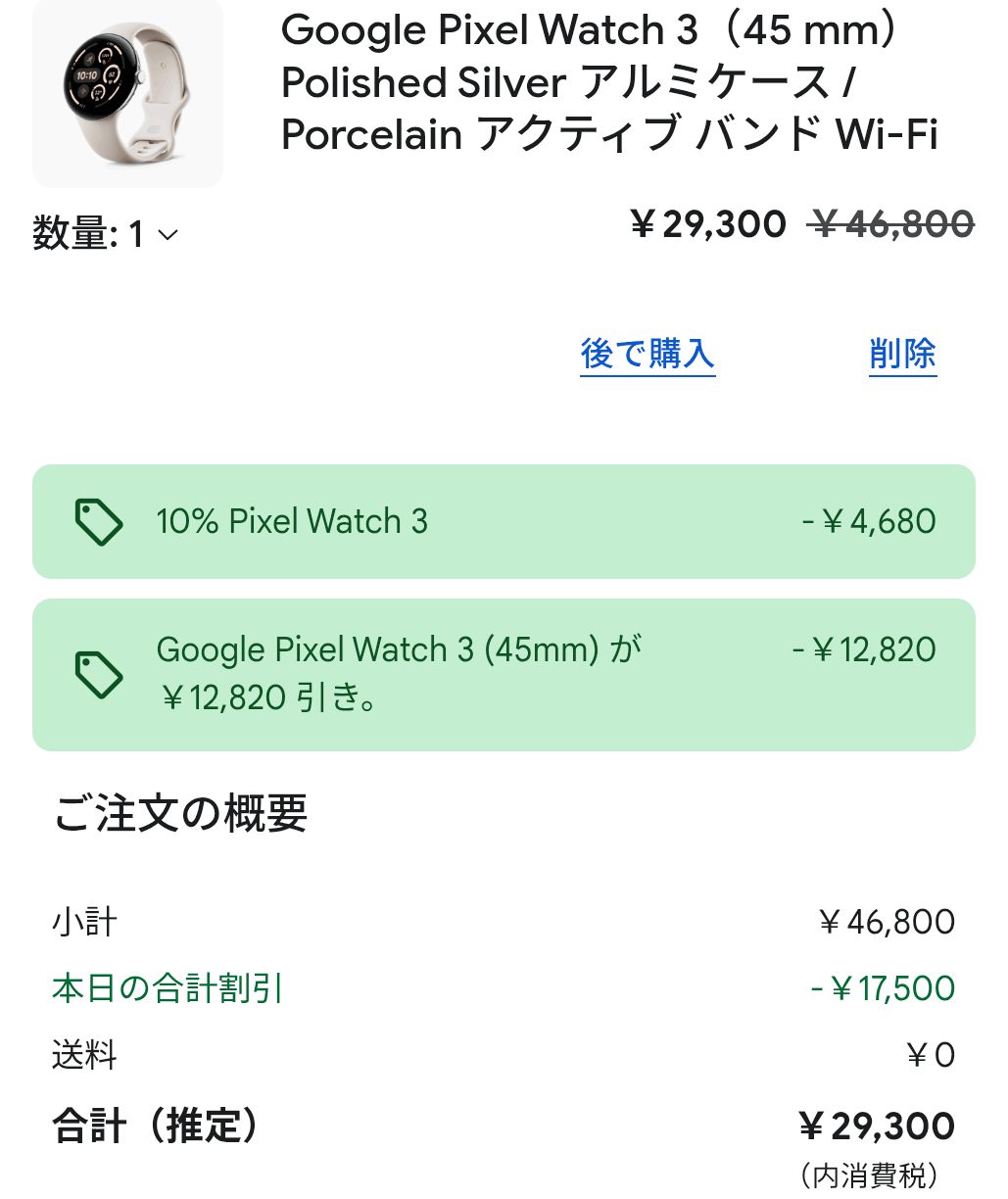 Watch 3は、大幅に値下げ販売されています。Pixel Watch 3 41mmのWi-Fiモデルが在庫がないので45mmが欲しい方は急いだ方が良いです。