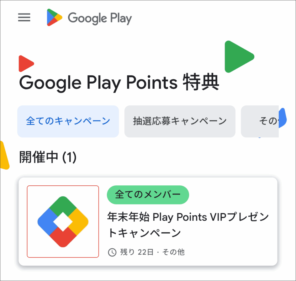 Google Play Points 特典にて『年末年始 Play Points VIPプレゼントキャンペーン』が開催中と明記されています。