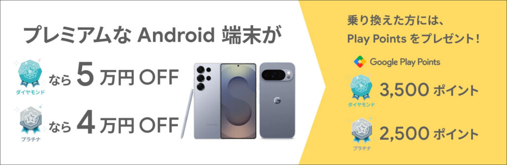 Google Playにて「最大 5 万円オフ !? プレミアムスマホ乗り換えキャンペーン」を実施しています。対象は、プラチナ以上のメンバーです。Google Play Pointがさらにもらえます。
