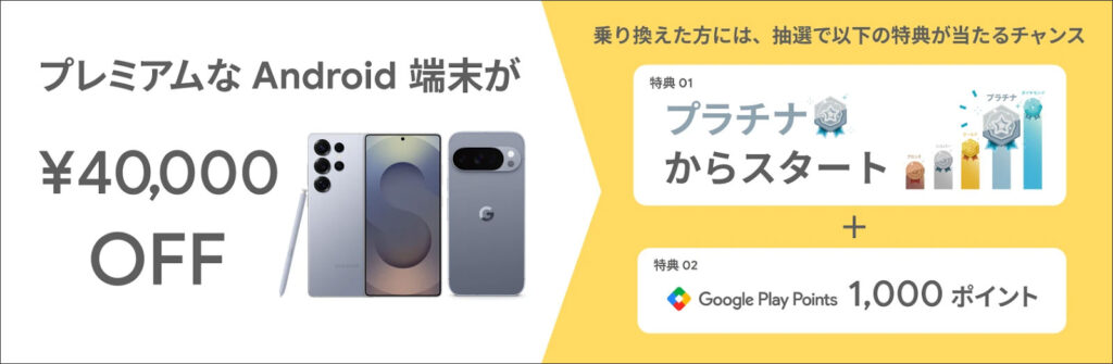 全員が対象です。乗り換えた方には抽選で「プラチナステータスからスタート」し、Google Play ポイントを1,000ポイントもらうことが出来ます。