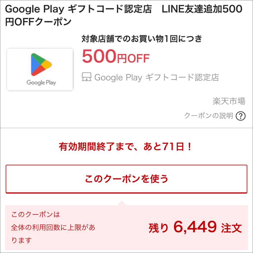 『Google Play ギフトコード認定店 LINE友達追加500円OFFクーポン』