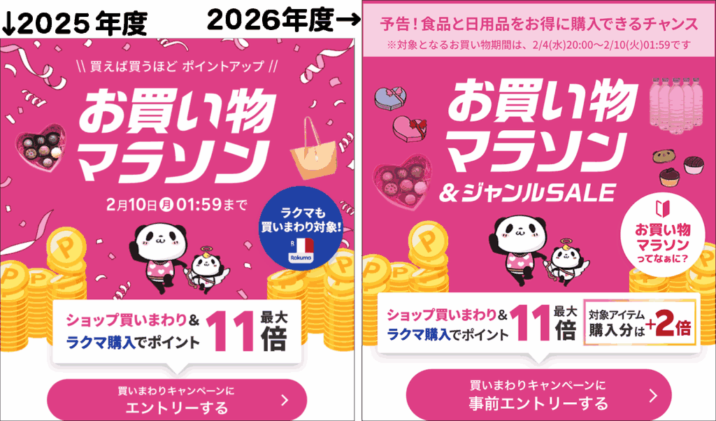 前年度と比較すると食料品と日用品がされています。具体的には3000円以上の購入で+1%です。上限は2000円。税別20万円の買い物で上限に達します。※マラソンにエントリーすると自動で本イベントにもエントリーっぽい