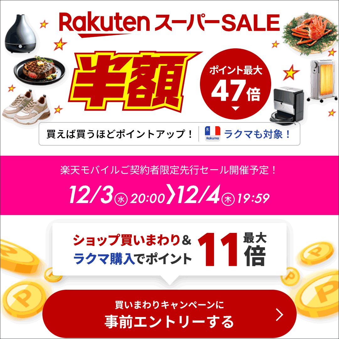 楽天スーパーSALEは、2024年12月4日(水)20:00~2024年12月11日(水)1:59です。