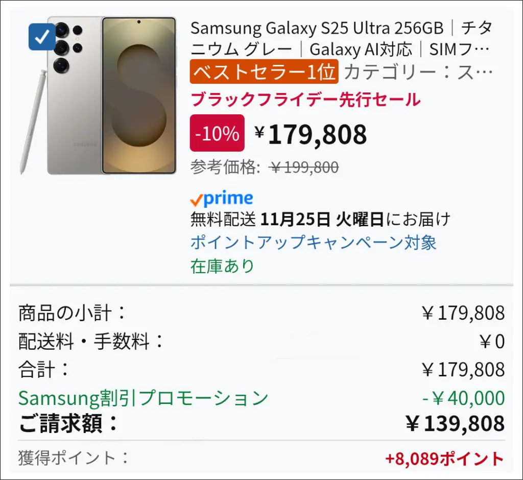 ↑在庫がないとSamsung Galaxy S25 Ultraにリダイレクトされます。23日20:04みたら在庫復活。ただし、到着は12月9日です。
