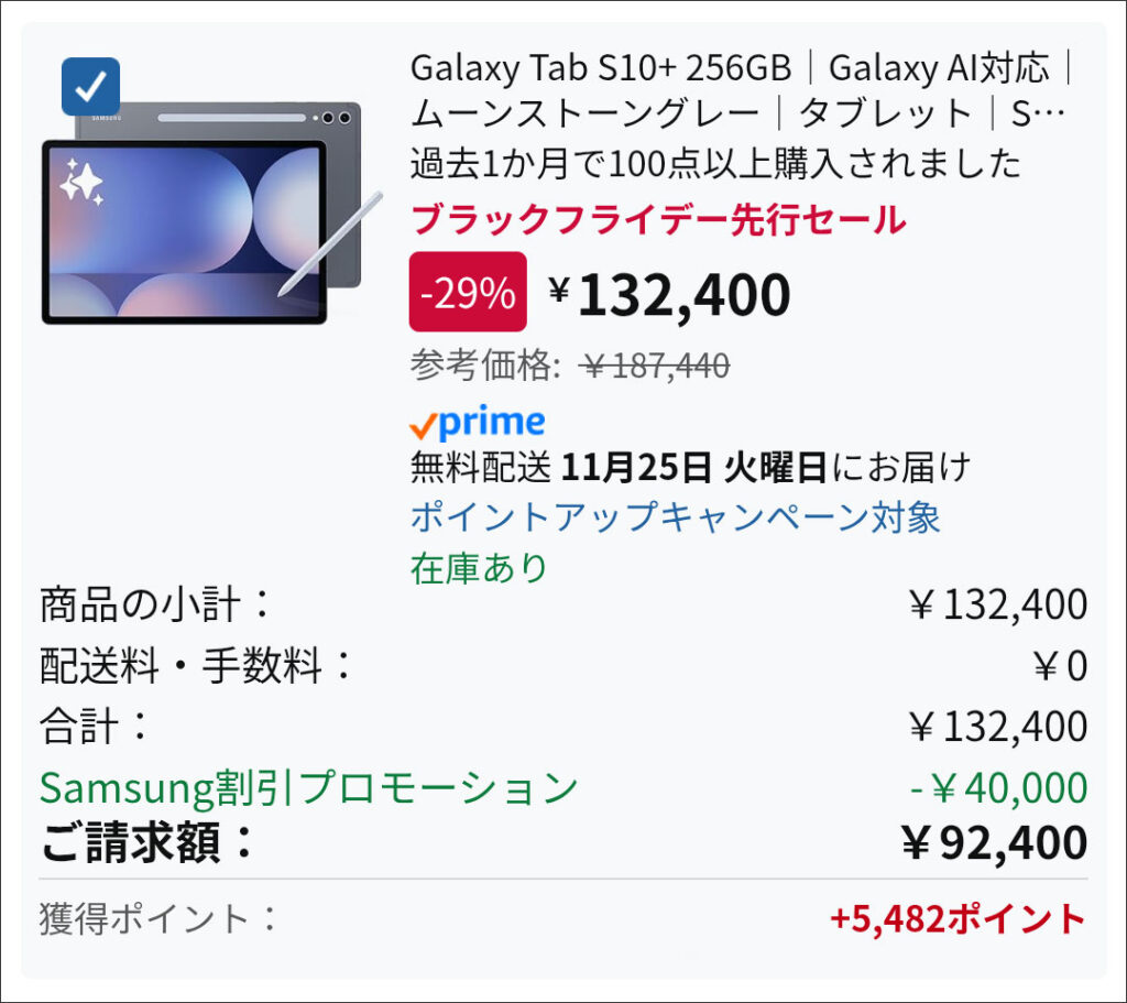 23日20:04みたら在庫復活 - Galaxy Tab S10+ 256GB 132,400円