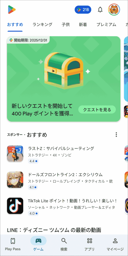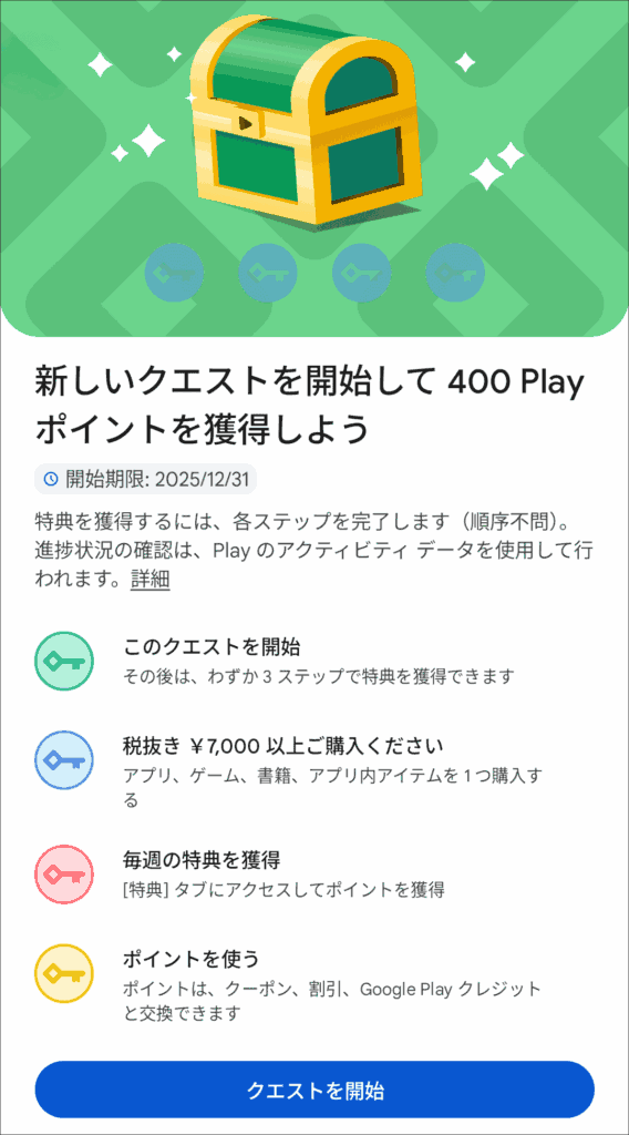 Google Play関するイベントで一定の条件を満たした方に2025年12月21日から2025年12月31日まで「新しいクエストを開始して400 play ポイントを獲得しよう」イベントが開催されています。
